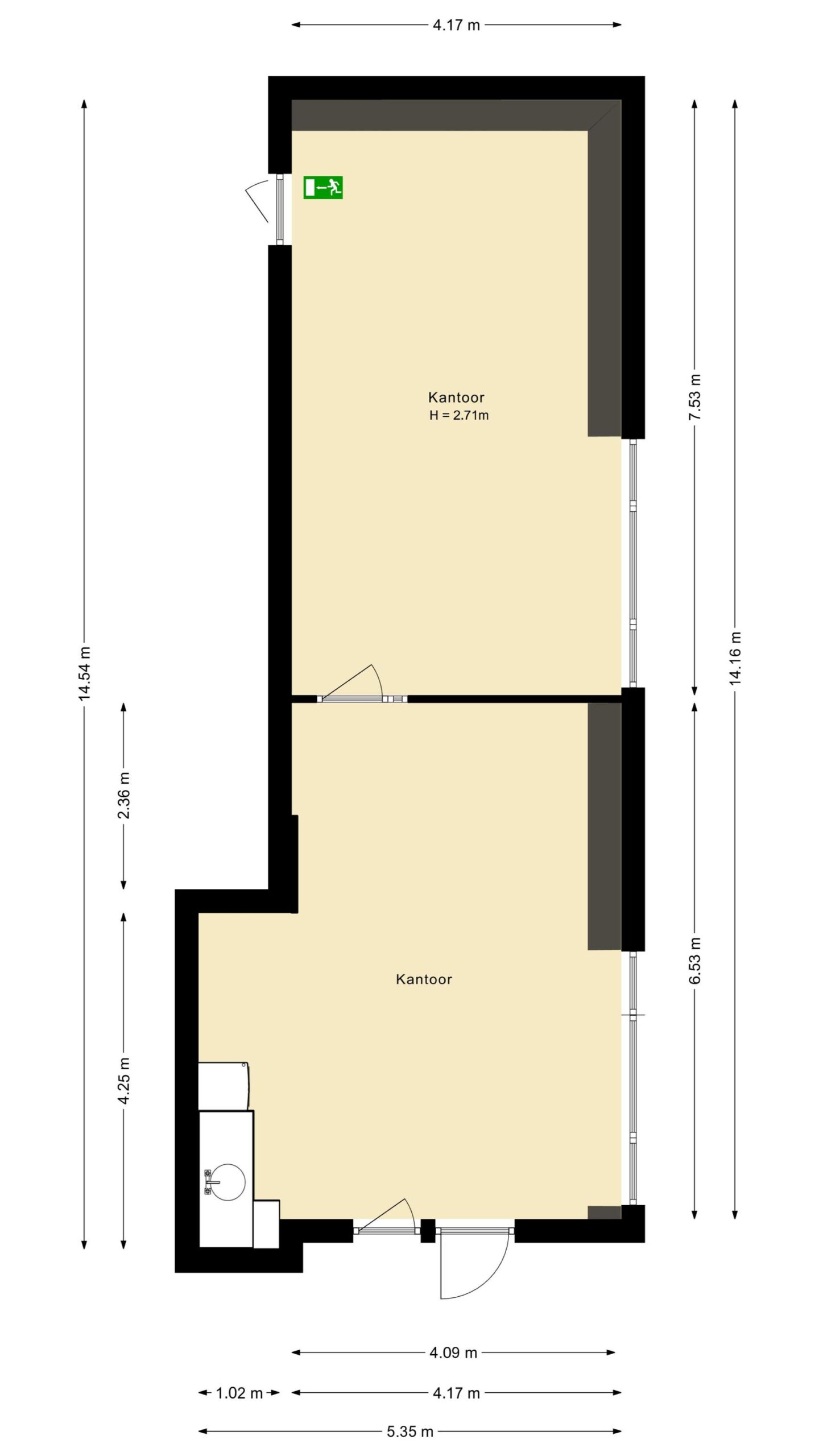 De kantoorruimte heeft een totale verhuurbare vloeroppervlakte van circa 65 m² en is efficiënt ingedeeld in twee separate kantoorruimten. Dankzij de rechthoekige opzet en goede lichtinval ontstaat een prettige en productieve werkomgeving. De aanwezige pantry en sanitaire voorzieningen maken het geheel compleet.