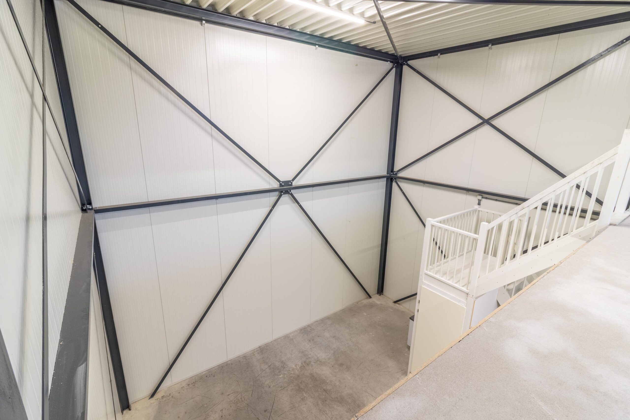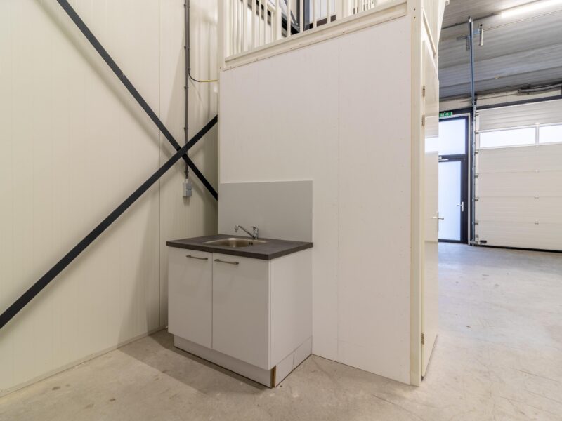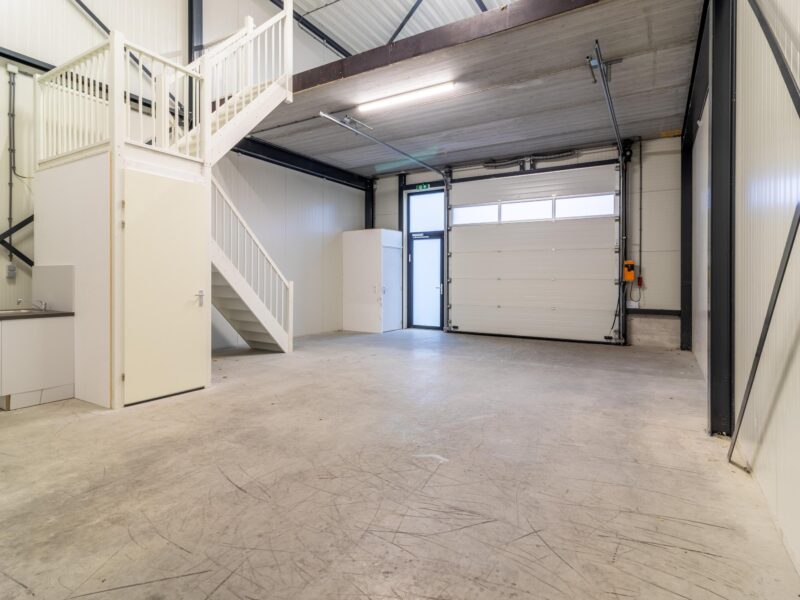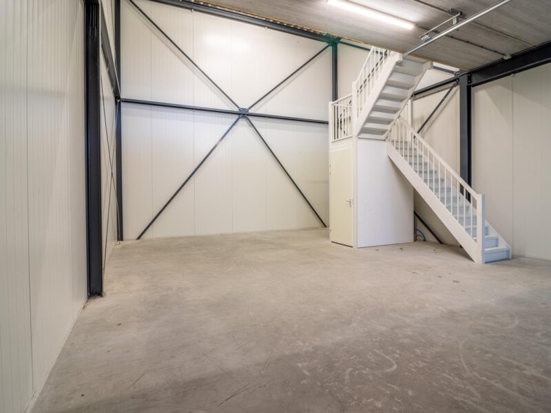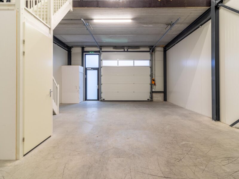 De begane grond heeft een vrije hoogte van circa 3,9 meter, wat de ruimte zeer geschikt maakt voor opslag of werkplaatsgebruik. Op de begane grond zijn tevens een pantry en een toiletruimte aanwezig. De tussenverdieping is uitstekend bruikbaar als kantoor, showroom of extra opslagruimte.
